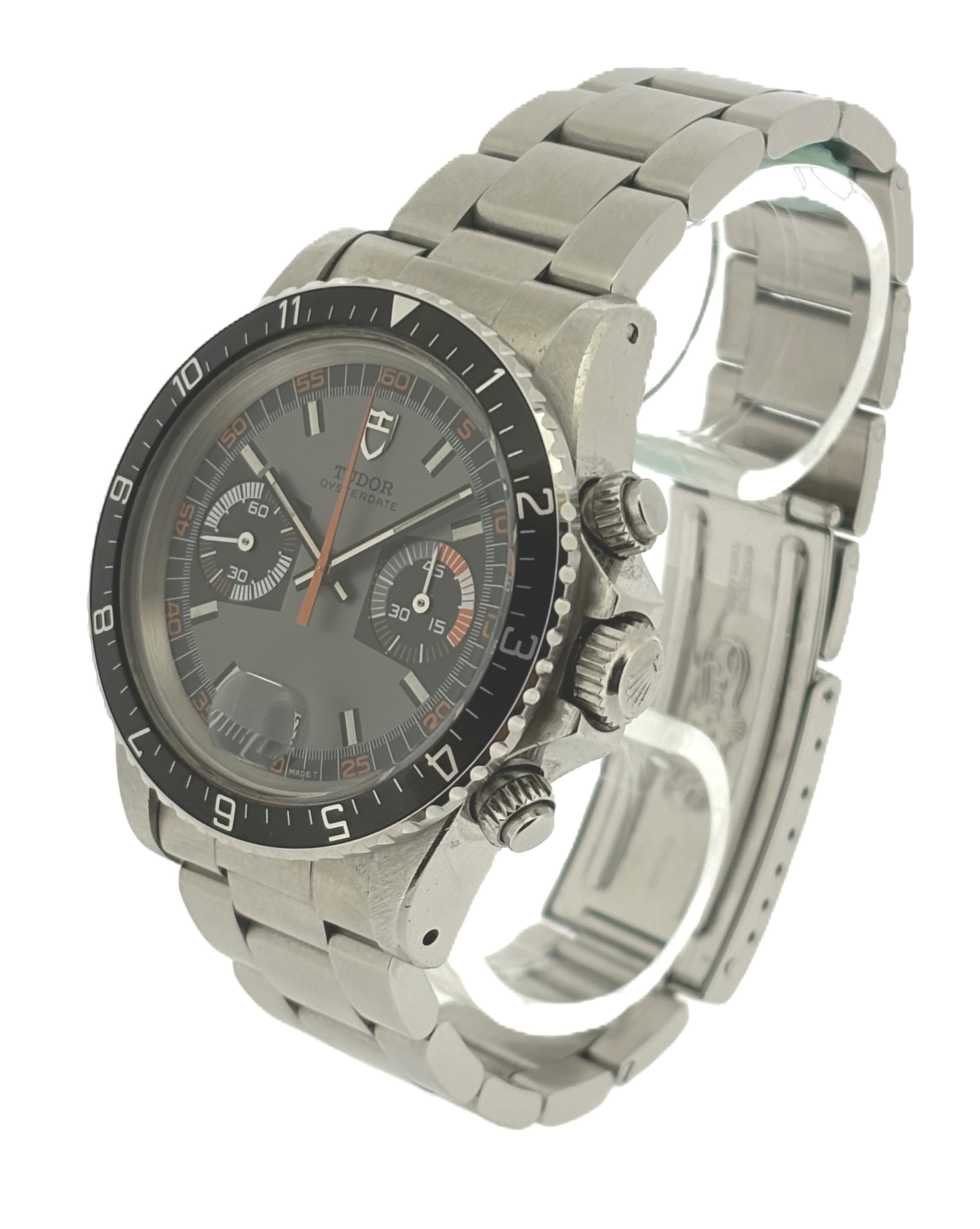 -Grey dial, 2 black counters (at 9 o'clock : subsidiary seconds ; at 3 o'clock : chronograph counter over 45 minutes)